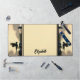 This beautiful photographic desk mat features the black silhouette of a little songbird perched on a feeder with wings spread. It is a simple yet elegant design with the black silhouette against a golden soft yellow background. Customisable for a Name or your own text.
