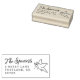 A cute return address stamp featuring a little bird holding a bow. Your family name and address appear aligned to the left in a combination of script lettering and rustic serif typography. This is a wooden stamp, a self-inking version of this design is available in our store. Visit our store for more return address rubber stamps.