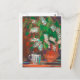 Postcard featuring pastel painting in impressionist style, spring still life - blooming bird-tree branches with bright white flowers and fresh green leaves in clay jar and coffee mug on striped tablecloth.
