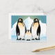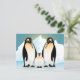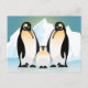 Bird illustration - the penguin family. Mum and dad looking down at baby. Baby penguin looking out to viewer. All 3 stood against a backdrop of ice.