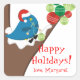 Cute fat blue bird with knitting needles Christmas holiday 'made with love' gift tag stickers for knit and yarn crafts and crafting. Bird sits on snow in a tree with balls of yarn for leaves, knitting from a ball of green yarn. Makes a neat "made with love" 'to from' sticker for your handmade gifts.