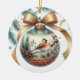 This white ceramic round ornament features a digital painted holiday design. The ornament includes a bow, pinecones, greenery, red berries, and a red-breasted robin. The back of the ornament has a Merry Christmas greeting and a timestamp. This ornament will beautifully complement a nature-inspired Christmas tree, especially one featuring songbirds. It's a thoughtful gift for any bird lover, with its pretty watercolor songbird design. AI artwork designed by susang6