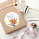 Wedding stickers with orange bird of paradise flowers. Customise blue script text, in modern handwritten font, to say "thank you" to guests for attending the wedding. Round stickers come in two sizes. Add to favour packages at the reception, shower, or other event. This design is meant for the round sticker shape, but may work on other shapes. Do not let text get near edges!