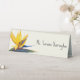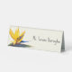 Bird-of-paradise tented place cards with name template. Ecru, plastic signs will stand at each place setting. Add each guest’s name in printed grey text next to a lovely yellow exotic Hawaiian flower.