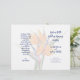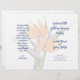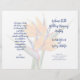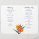 Folded wedding program template with orange bird-of-paradise flowers. White paper with four pages to customise in script and printed dark blue text. The big floral background will wrap around from the front page to the back. Inside a smaller flower decorates the bottom centre of the page. Include a message to family and friends on the last page / back of program when folded. Will need to be folded by the customer.