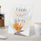 Cards and gifts wedding table sign with orange bird of paradise flowers design. Dark blue text is printed on a plastic pedestal sign. The image shows the 8x10 size, with larger sizes available. Set on the gift table at a reception, or shower.