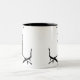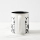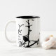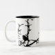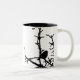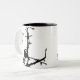 This contemporary fine art mug features a black and white silhouette modern abstract pattern of a Dark-eyed Junco (Junco hyemalis) perched on a bare branch high in a tree. This bird is actually a kind of small, grey and white sparrow. The design is repeated on the right and left sides.