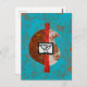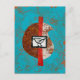 Funny bird illustration over a brown and beige collaged shape with orange strip down centre - all over a turquoise and orange textured background.