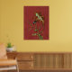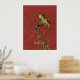 This artwork by G.A. Audsley, featured in Section V Plate V of his collection, presents a beautifully detailed Japanese bird and plant print. The background is a rich dark red with irregular black vertical stripes and spots, creating a striking contrast with the foreground. In the centre, a bird is perched on the stem of a large lotus leaf, seemingly admiring the delicate flowers around it. The overall composition reflects the intricate and graceful style typical of Audsley’s work, combining natural elements with ornamental design.