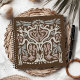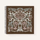 Square, 8.5 inch notebook with original, hand-illustrated "bird tree" image on the front. Created using calming, neutral shades of gray and mauve-tan over a dark brown background. The abstract woodland image portrays a branching tree filled with birds, bugs, and wildlife. The flowing design gives a feeling of ecological balance in nature. This notebook has many page options, from blank for drawing, to graphs, lined and bullet points for list making. The same design is on the back cover.