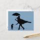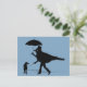 A silhouette of a bird wearing a top hat. The bird has legs and arms. It's holding an umbrella and a leash attached to a dog.