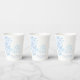 Personalise these wedding party paper cups with your own couple's names and wedding date. Cute birds by a cage with spring blossom in pretty blue shades on white, other matching items are also available. © Original graphic two birds in an open birdcage drawing with graphic hearts design by Sarah Trett for www.mylittledenweddings.com on Zazzle.