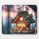 A whimsical birdhouse adorned with fresh green moss is host to several small birds with an illuminated "OPEN" sign inviting them