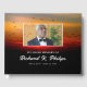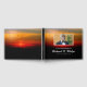Birds at sunset life celebration guest book featuring a beautiful photo of birds soaring across a cloud-streaked sky in the beautiful colours of sunrise with glowing reds, golden yellows, and a hint of mountains along with a photo of your loved one. Dawn-themed funeral guestbook with a photo of your loved one, an elegant font and a modern script against a background featuring birds at sunrise, their silhouettes dark against the colourful sky. Sunset-themed memorial service guest book in bright red and yellow and white text against a black background personalised with a photo of your loved one.