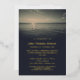 Memorial service invitation in charcoal and a touch of warm, pale orange, featuring a photograph of two birds landing on the ocean at sunrise and the funeral invitation wording in gold foil.