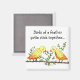 Two little birdies perched on a branch with vines, chirping to one another. A cute saying 'birds of a feather gotta stick together."