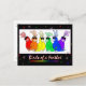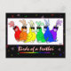 A collection of birds in rainbow hues - rainbow pride stripe on the bottom with rainbow coloured confetti shapes.