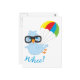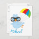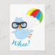 Illustration of an adorable bird, complete with glasses, attached to a parachute. Text reads, Whee! Too cute!