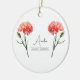 The birth month flower January Carnation ornament features a beautiful illustration of a carnation flower. Below the flower, there's a customisable name written in elegant script font. Underneath the name, it says "January - Carnation", indicating that her birth flower is the carnation. It's a lovely personalised ornament, a thoughtful gift for someone born in January.