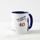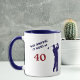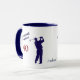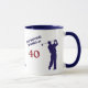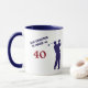 On this cute birthday mug, a navy blue silhouette golfer takes a full swing. The blue and red text next to the image says "Still DRIVING IT HARD at 40". Sure to be an office conversation starter for any man who loves to golf! The image is printed on both sides, with his name or other custom text between them.