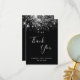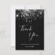 A thank you card for a 50th (or any age) birthday. A black background colour, decorated with faux silver glitter. On front large white coloured hand lettered script and the text: Thank You, your text, title and a date.