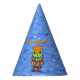 This paper party hat is a mix of shades of blue with a neon colored abstract owl with a green head, orange face, star shaped eyes and multi colored body. Customize the Happy Birthday text with the template.