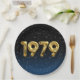 Gold foil balloons for 1979 birth year on gradient black and blue background with night stars for birthday party.
