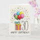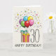 Destei's original birthday theme design featuring colourful birthday balloons and two present boxes wrapped with pretty bows. The design is framed by cheerful confetti made out of stars and dots. The colour scheme includes colours such as red, pink, blue, yellow, purple, teal, and beige. There are also two personalizable text areas where one is meant for the person's age and another is meant for custom text. The custom text area now reads: "Happy Birthday!".
