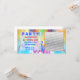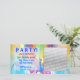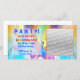 A general birthday party invitation photocard. Customisable text reads: PARTY! you're invited to Jan's birthday party! July 23 1pm to 5pm, 222 Neon Avenue, RSVP by July 20, 555-555-5555. Change the text to suit your event. Add a photo of the party guy or gal! Great for children or adults.