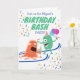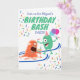 Birthday Bash Party invitation with funny monsters getting ready to eat cake, laughing, and holding flags and balloons. Add your birthday child's name to the cover and add your event information inside. Art, image, and verse copyright © Shoaff Ballanger Studios, 2022.