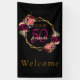 A banner for a 50th birthday party. A chic black background with a faux gold geometric frame. Decorated with dark purple and burgundy flowers, roses and boho style feathers. Templates for a name, age and a date. Date of birth or the date of the party. The name is written with a hand lettered style script, pink colored letters, age 50 in purple and the date with golden numbers. The text: Welcome