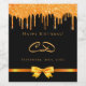 Faux gold coloured ribbon and bow with faux gold glitter drips, paint dripping look. A chic black background. Personalise and add your monogram, initials and a date. With the text. Happy Birthday. Golden coloured letters.