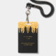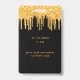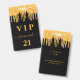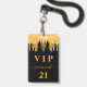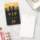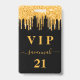 A modern, stylish and glamourous badge for a 21st (or any age) birthday party. A black background with faux gold glitter drip, paint dripping look. The name is written with a modern hand lettered style script with swashes. With the text: VIP Number 21 is written in a golden colour. To keep the swashes only delete the sample name, leave the spaces or emoji's in front and after the name.