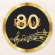 Black background with faux gold music notes for a 80th birthday party. With a faux gold frame. Templates for age and name. The name is written in a hand-lettered style script. Golden letters and number.