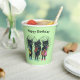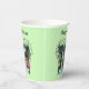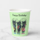 These paper cups are green with three musical black cats in colourful clothes of pink, blue and green playing music instruments on a heart made of black music notes. Customise the Happy Birthday text with the templates on the front and back.