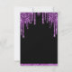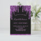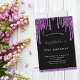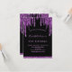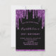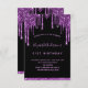A girly and feminine 21st (or any age) birthday party invitation. On front: A chic black background. Decorated with dark purple faux glitter drips, paint dripping look. Personalise and add a name and party details. The name is written with a hand lettered style script, light purple coloured letters.