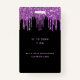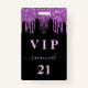 A modern, stylish and glamourous badge for a 21st (or any age) birthday party. A black background with purple faux glitter drip, paint dripping look. Personalise and add a name and age 21. The name is written with a modern hand lettered style script with swashes. The text: VIP og Number 21 is written in a light pink colour. To keep the swashes only delete the sample name, leave the spaces or emoji's in front and after the name.