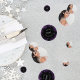 A classic black background decorated with dark purple coloured faux glitter, sparkles. Personalise and add date, name, age and a photo.