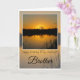 Happy Birthday Brother. Beautiful orange sunrise behind oak tree silhouette, reflected on lake with black reeds in the foreground. Text says: Happy Birthday to my wonderful Brother. Inside card is blank.