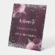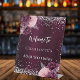 A dark gradient burgundy background. Decorated with faux silver sparkles and burgundy and pink flowers, roses. Personalise and add a name and age/event.
