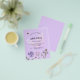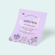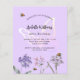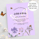 A violet, lavender coloured background. Decorated with bees and painted wildflowers in violet and pink and a large butterfly. Personalise and add a name and party details.