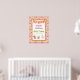 A personalised birthday party gift table poster. Designed with a cute illustration of a smiling lion wearing a party hat, a fuzzy sheep with birthday balloons and a birthday cake with 3 candles.. Set on a pink, green and yellow geometric pattern. Perfect for 3 year old's birthday but also good for birthdays of all ages.