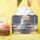 A tiered birthday cake on a pedestal dessert plate with many glowing candles