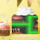 With a green frame around a Cake with three flaming Candles.