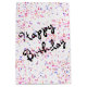 Colourful birthday candy sprinkles on white background with Happy Birthday text.