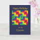 A birthday card for a cousin with a bright patchwork quilt design from a cot-quilt made by Judy Adamson.