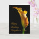 A stately golden arum lily stands lit from the side . A perfect flower to convey your birthday wishes.