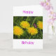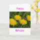Four cute bright, yellow dandelions in green grass, purple text: "Happy Birthday"
