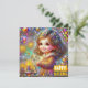 The card features a retro girl at a lights display with bright balloons, fireworks, sparklers, and candles. The greeting is "Happy Birthday." The back has a small version of the front image and plenty of room to write a message. AI Bing assisted in the creation of the card.