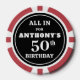 Personalised poker chips to celebrate any age birthday (shown for a 50th) with a casino or poker night theme. The design features the text ALL IN FOR NAME'S # BIRTHDAY in your choice of text and background colours and your choice of poker chip colour (shown with white text on a black background on a red poker chip. Make text and background colour changes in EDIT and choose other poker chip colours on the ordering page. Utilise as birthday thank you favours or special prizes or rewards at your celebration event. ASSISTANCE: For help with design modification or personalisation or if you would like coordinating items, contact the designer BEFORE ordering via the Zazzle Chat MESSAGE tab or email at makeitaboutyoustore@gmail.com.